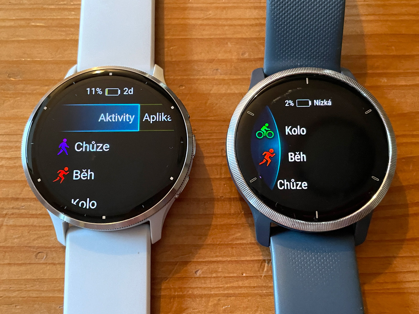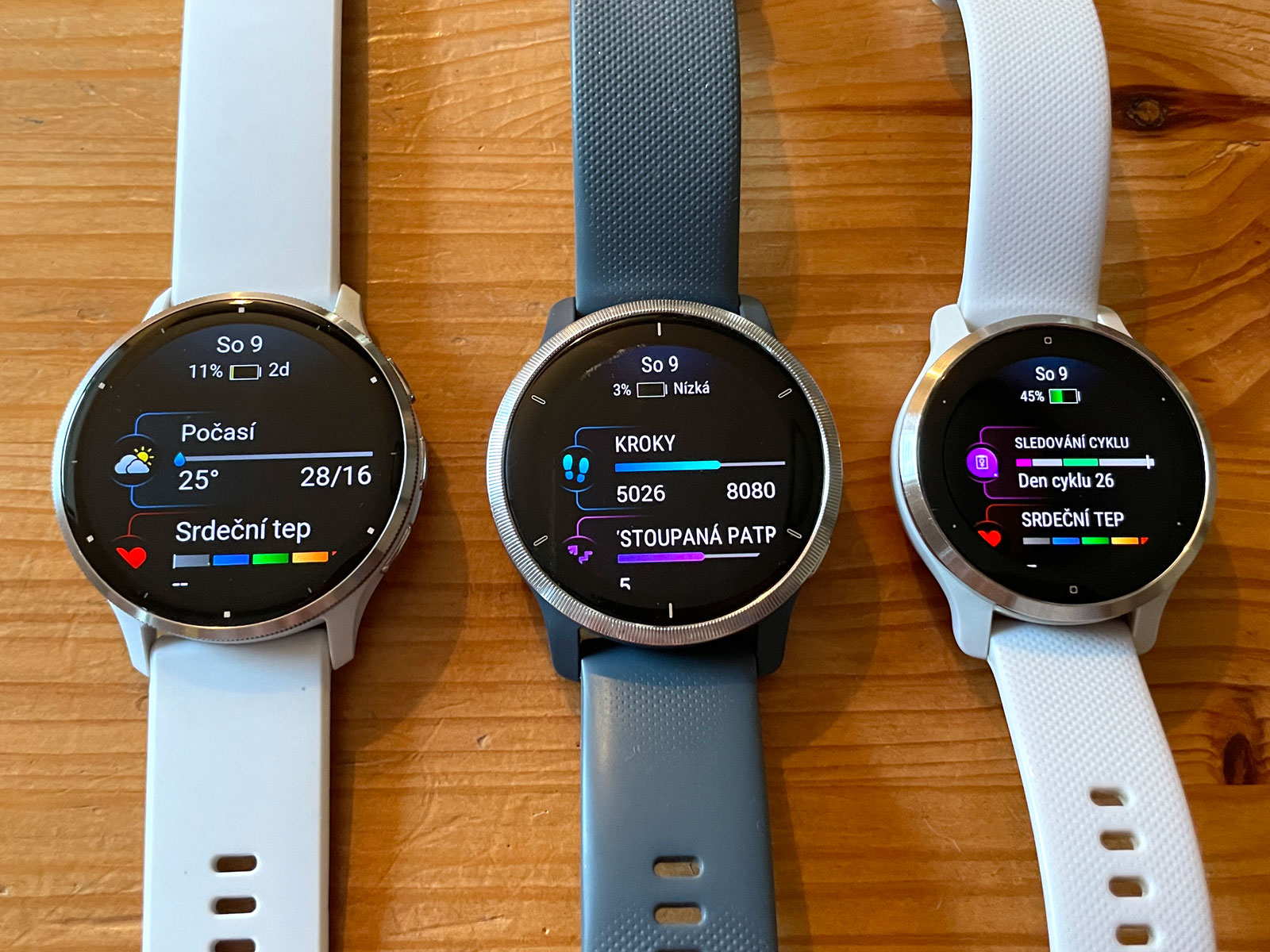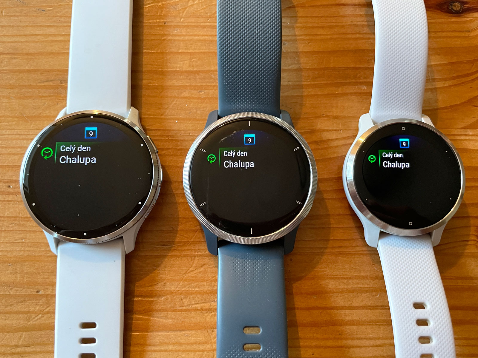 Protože každé hodinky používá jiný uživatel (V2S moje žena, V2 moje dcera), nemohl jsem nafotit srovnání ve zcela stejných situacích. Na Venu 3 a Venu 2 jsou odlišné doplňky, data, přijaté notifikace. Například se mi vůbec nepodařilo na Venu 2, které používá moje dcera, zobrazit text normální notifikace, jen text z Instagramu - když jsem jí cokoliv posílal na Whatsapp, notifikace po zobrazení vždy zmizela. To samé na Venu 2S, takže jsem v závěru už fotil jen Venu 3 a Venu 2. Holt, je to jen technika...