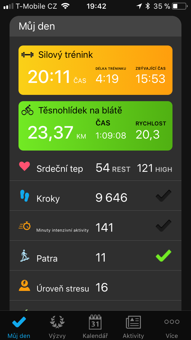 Dále už je to ale stejná pohádka. Na displeji náramku se zobrazuje řada doplňků s nachozenými kroky, intenzivními minutami či počasím. Náramek má velmi tenké provedení díky novému snímači tepu, který umí zaznamenávat i celodenní skóre stresu. Více jsem se tomu věnoval ve starším článku. Novinkou oproti staršímu Vívosmart GPS je nová aktivita pro cvičení v posilovně, která zaznamenává počet opakování v sériích. Opět jsem to podrobně již rozebíral.