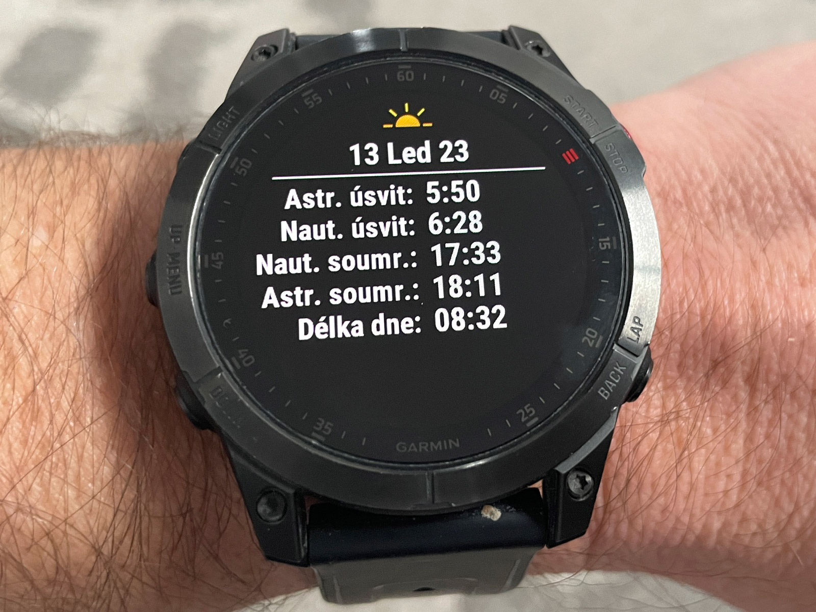 Standardní dopkněk východu a západu slunce ukazuje už delší dobu obrazovku s 24hodinovým okružím, na které vidíte aktuální čas, a uvnitř čas východu a západu slunce, stejně jako čas úsvitu a soumraku. Loni v zimě pak dostaly hodinky Fénix 7 a Epix výrazně vylepšený doplněk, který přidal řadu zajímavých funkcí.