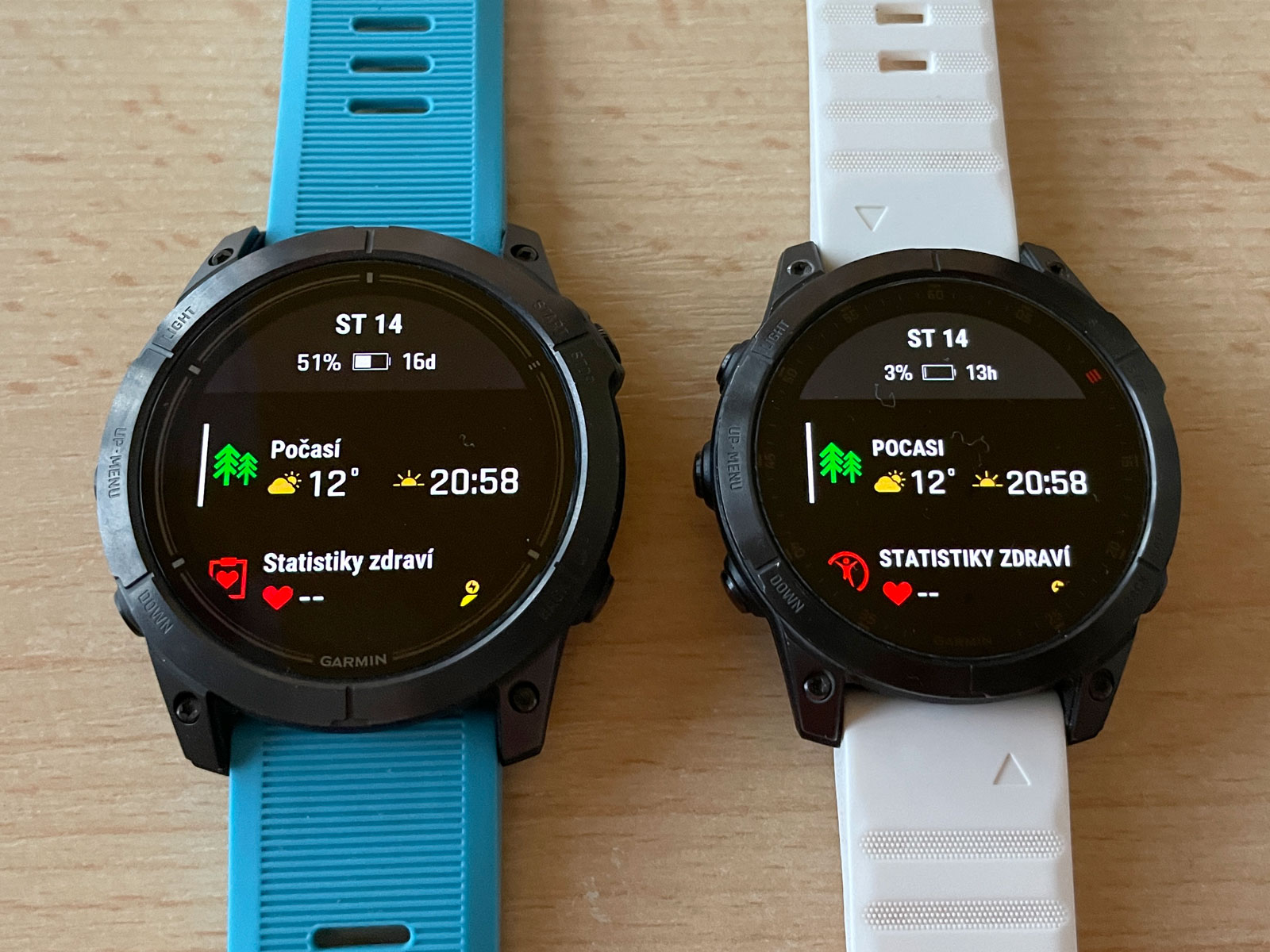 Ale k jádru pudla: Větší baterie prodloužila výdrž 51mm modelu oproti 47mm na rovný dvojnásobek. V režimu hodinek je to 31 dnů vs. 16 dnů, s GPS pak 82/58 hodin vs. 42/30 hodin - první údaj je s vypnutým displejem, druhý pak s always-on. A výdrž v režimu hodinek s trvale zapnutým displejem pak dosahuje 11 dnů vs. 6 dnů u středního modelu.