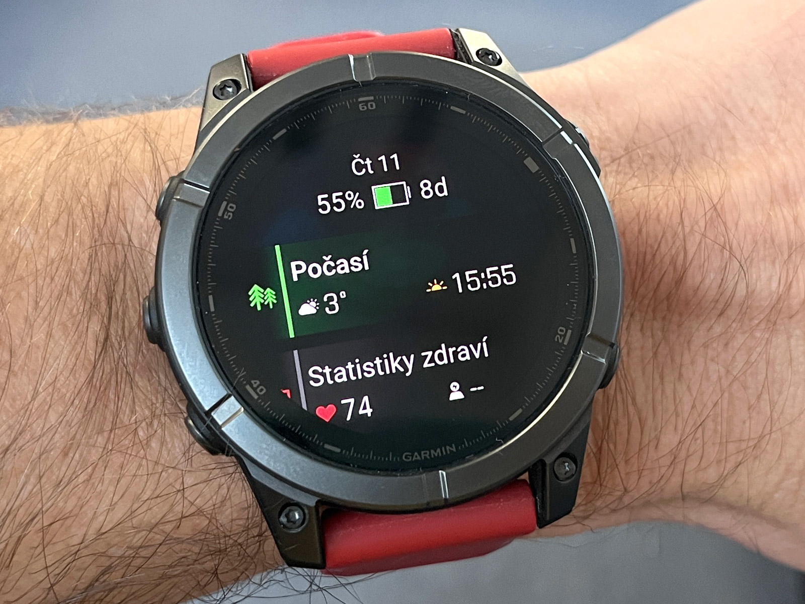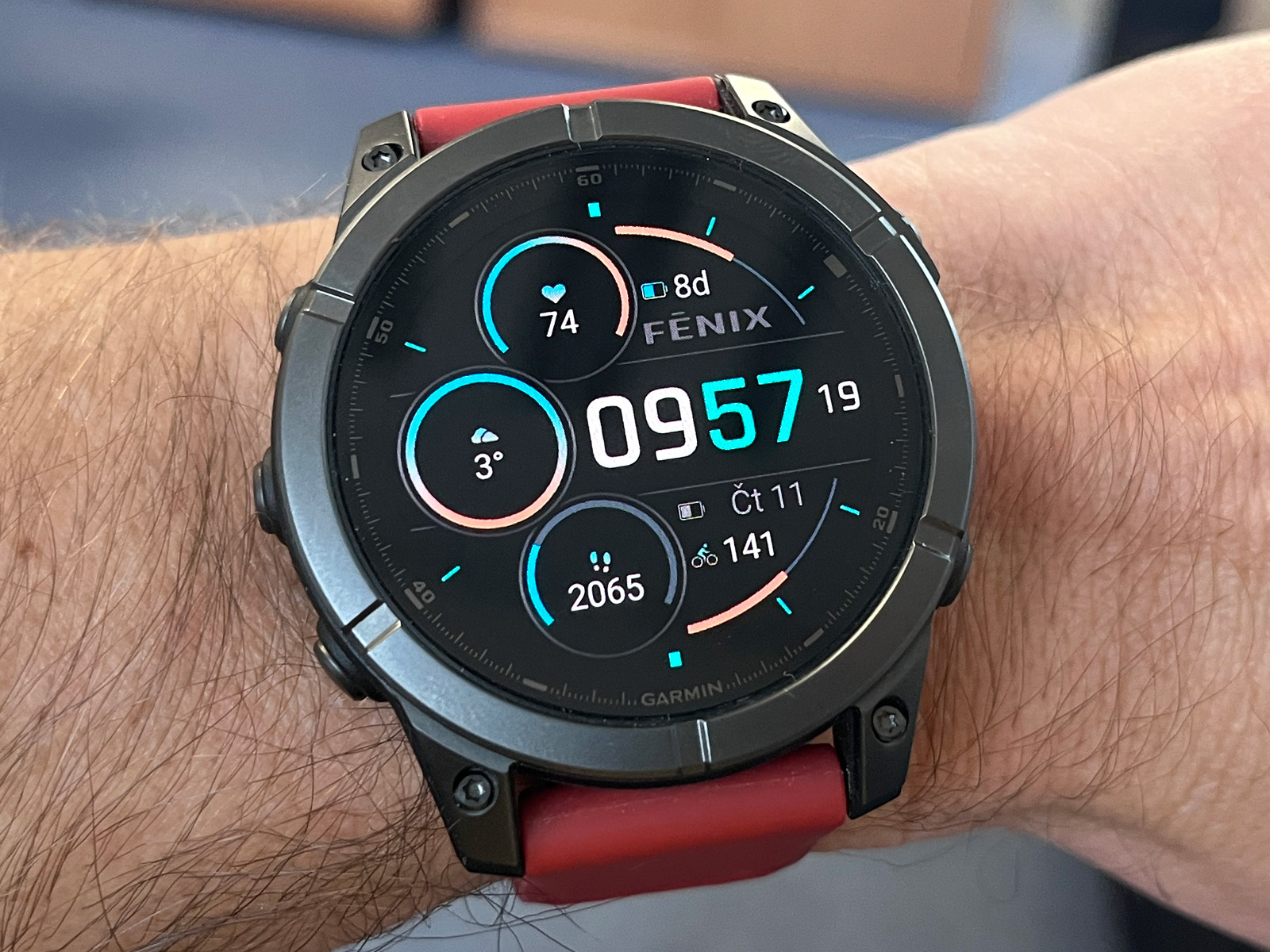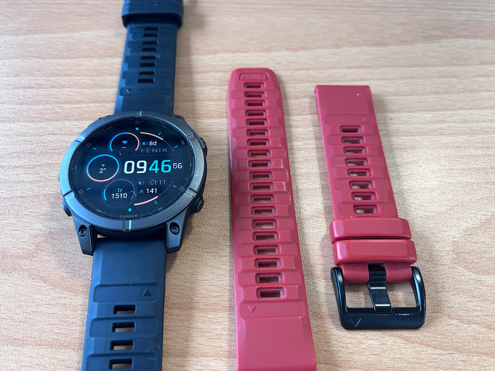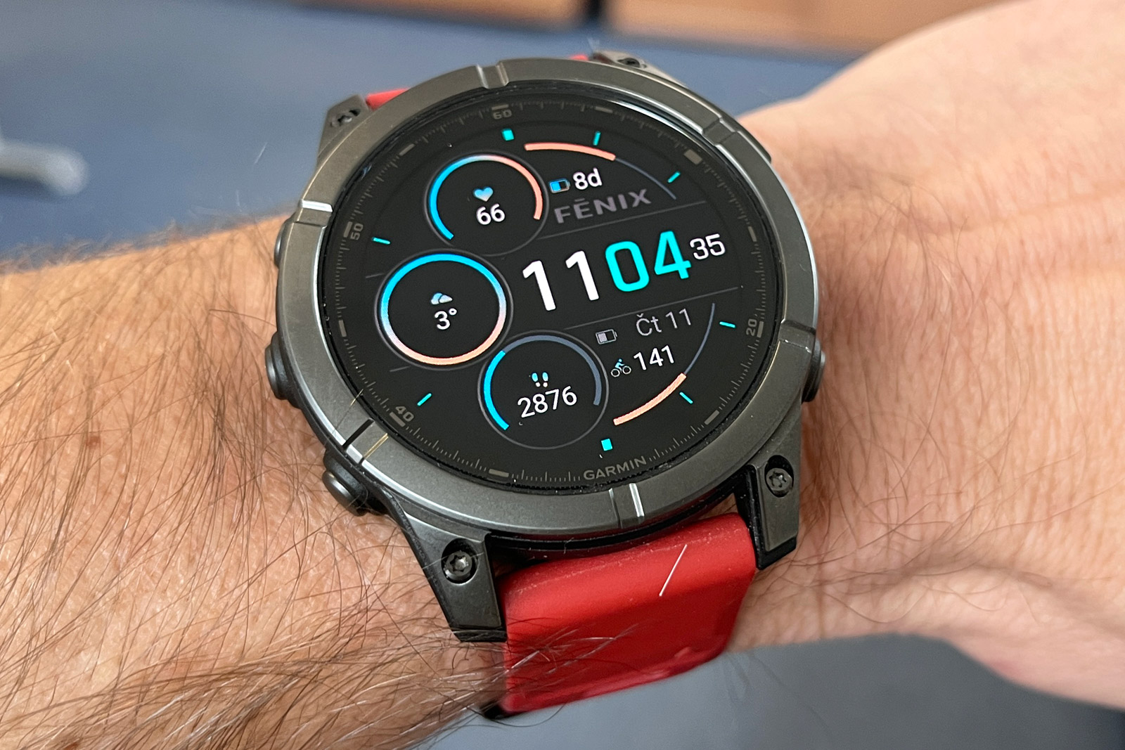 Každopádně hodinky na ruce jsou docela fajn, i když takové Forerunnery 970 váží výrazně méně a jsou nositelnější. Černý silikonový řemínek QuickFit 22 mm jsem vyměnil za tmavě červený, který jsem měl dříve na Fénixech 8 (ty měly červenou krytku barometru a dobře to k sobě sedělo), a je to docela fajn kombinace. Rozhodně se mi Éčka líbí více než Forerunnery, prostě jsou to Fénixy a ty vypadají dobře.