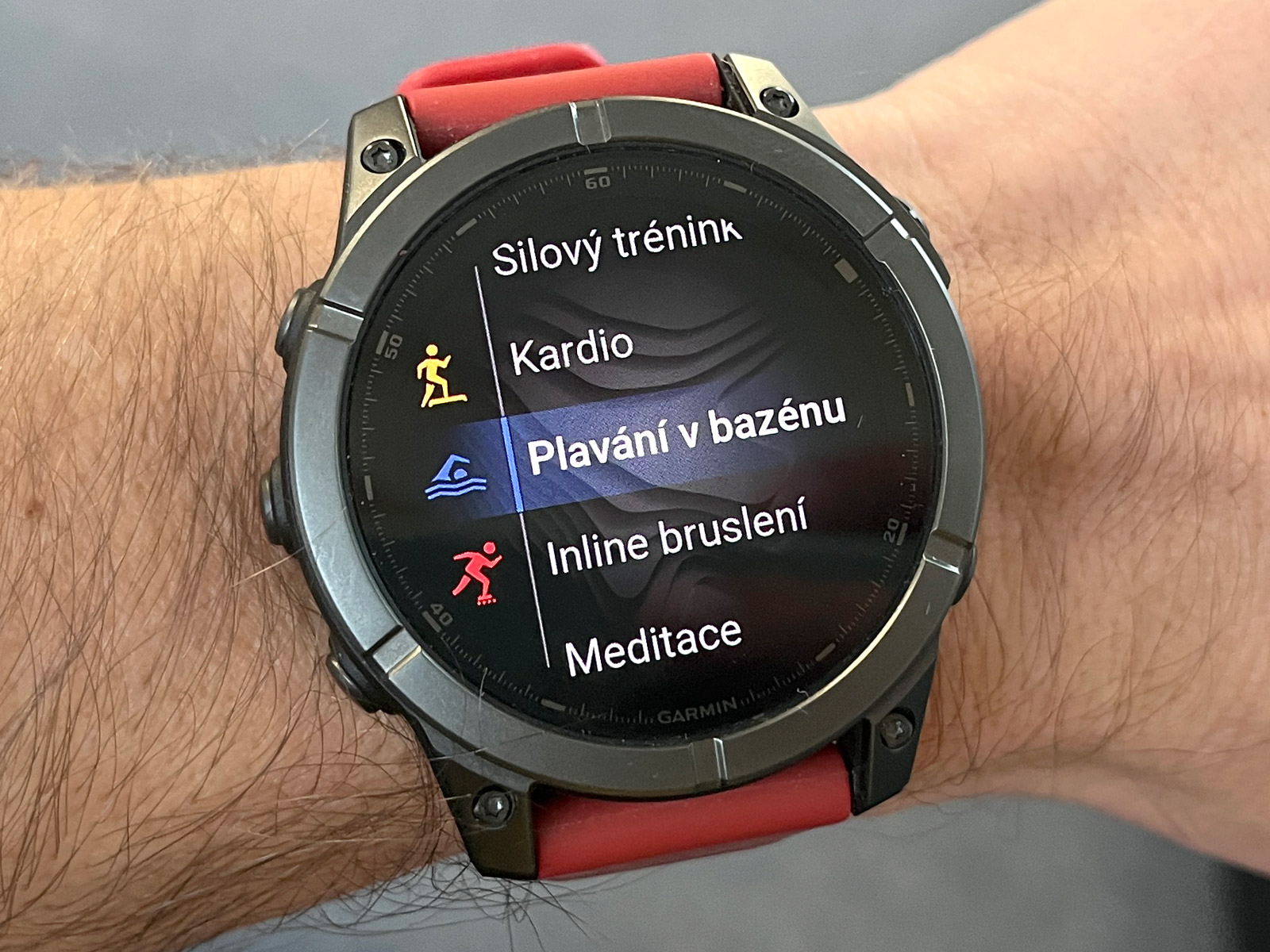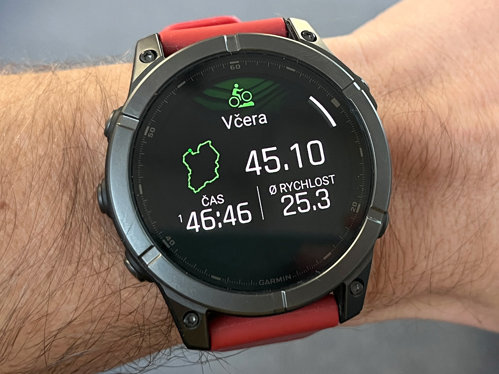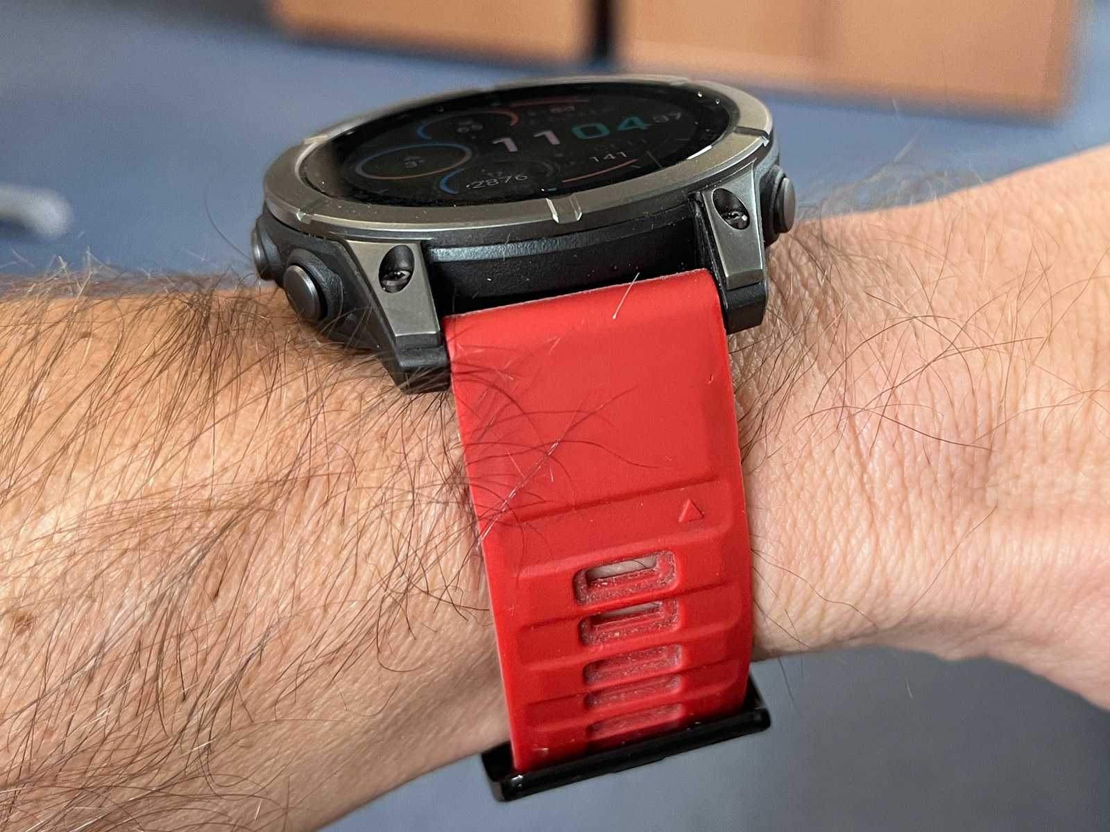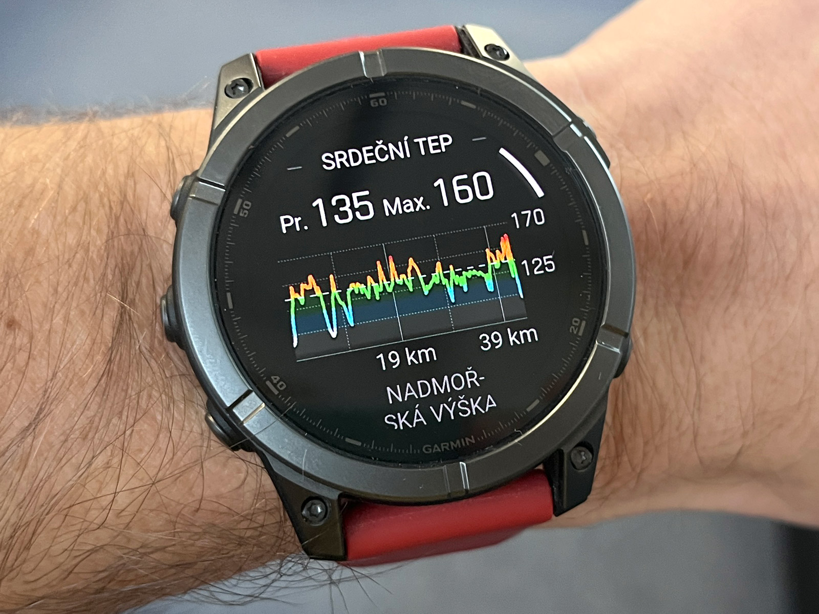 Každopádně hodinky na ruce jsou docela fajn, i když takové Forerunnery 970 váží výrazně méně a jsou nositelnější. Černý silikonový řemínek QuickFit 22 mm jsem vyměnil za tmavě červený, který jsem měl dříve na Fénixech 8 (ty měly červenou krytku barometru a dobře to k sobě sedělo), a je to docela fajn kombinace. Rozhodně se mi Éčka líbí více než Forerunnery, prostě jsou to Fénixy a ty vypadají dobře.